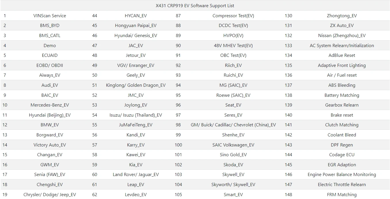 Lista de soporte de software EV X431 CRP919: